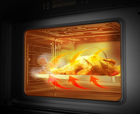 腔體內(nèi)三面分布5根烤管,搭配鈦合金風(fēng)扇,形成熱量循環(huán),食材每一面都受熱均勻,烤色一致,避免局部烤焦